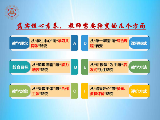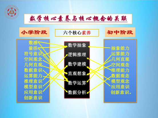 黄俊辉老师分别从核心素养与数学核心素养、提高学生数学核心素养的基本策略、核心素养背景下的数学课堂教学实施三个方面进行授课。他讲到“核心素养”是学生在接受相应学段的教育过程中,逐步形成的适应个人发展和社会发展需要的必备品格和关键能力,既包括跨学科核心素养,又包括学科核心素养;数学核心素养是学生在接受相应学段的教育过程中,逐步形成的适应个人终身发展和社会发展需要的人的、具有数学特征的思维品质与关键能力,包括数学抽象、逻辑推理、数学建模、直观想象、数学运算、数据分析等,目标是用数学的眼光观察世界、用数学的思维思考世界、用数学的语言表达现实世界。