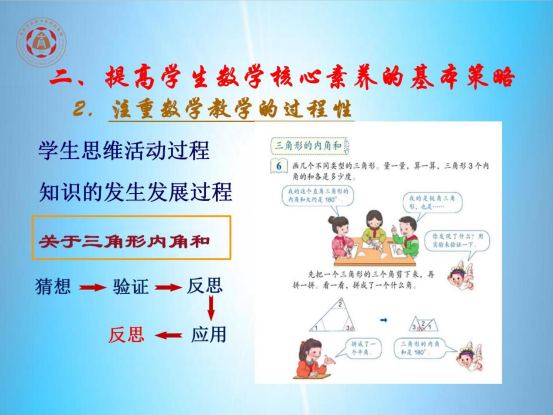 在讲到核心素养背景下的数学课堂教学实施时,黄俊辉老师说要基于核心素养的进行教学设计,通过分析、设计、评价三个维度目标的综合思考:学什么、怎么学、有什么意义进行考虑;要定位学科核心素养的载体,他说学科知识的教学是最本质的,是否理解本学科教学的实质性内容并保证传授,是否了解任一课时教学的知识逻辑并合理讲解,是否掌握学生知识与学科知识关系并加以诠释等,紧扣学科核心素养这个着眼点,注重顶层设计,他建议同学们在未来的教学中要将知识问题化,问题情境化,有效的小学数学教学,应该使学生置于问题情境中,让他们去经历智力的探险;他指出数学基本思想的教学,重在引导学生感悟。要着眼于学生的长时性、持续性、深入性数学学习的需求,以大概念为统领结构化、整体化思考单元教学,要用有联系、结构化的教学设计,才会激起学生主动探究、深入思考的愿望,也才会让学生有展现个性思维、发挥创造能力的机会,教师给孩子多大的空间,学生就会展现多少的精彩,曲折坎坷的学习过程,会让学生面临更多的挑战。想要前行,学生就要开展更多更深的思考,就需要理解、碰撞别人的思维,思维被全部激活,是数学课堂最高的境界。