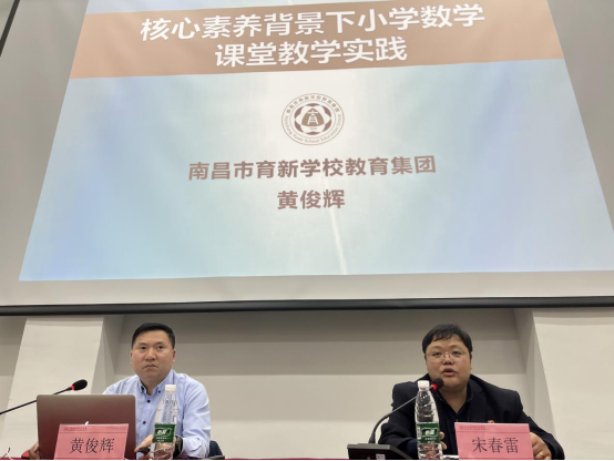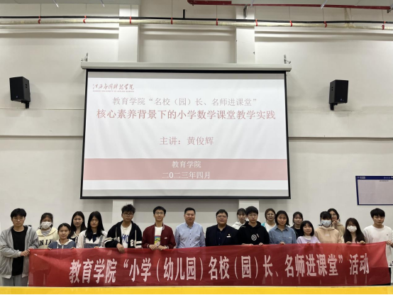 为了进一步密切学院与小学(幼儿园)的交流和沟通,深化“院-园、院-校”协同育人机制,发挥名校(园)长、名师及其团队的教学引领、指导、辐射作用,强化学院师生对基层小学(幼儿园)师资需求和课堂教学改革的清醒认识,加深学生对小学(幼儿园)教师专业知识、专业技能和教育情怀的认识和理解,提升学生的责任意识和专业使命感,教育学院筹划举办“小学(幼儿园)名校(园)长、名师进课堂”活动。4月9日学院邀请南昌市育新学校教育集团原理事长、校长,中小学高级教师(数学),江西省教育学会理事,南昌市基础教育课程改革实验工作专家指导组成员黄俊辉老师在志远楼101教室为学院2020级、2021、2022级小学教育专业讲授《核心素养背景下小学数学课堂教学实践》课程,学院党总支书记宋春雷主持课程讲座。