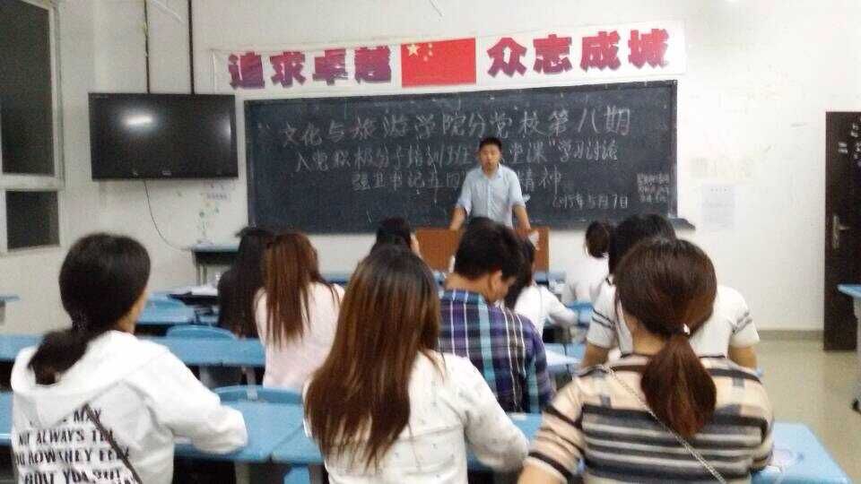 2015年5月6日晚上9:00,文化旅游学院分党校第八期入党积极分子培训班第六堂党课在三达楼西区226教室举行。在本期班主任杨帆老师的组织下学习了强卫书记“五四讲话”。