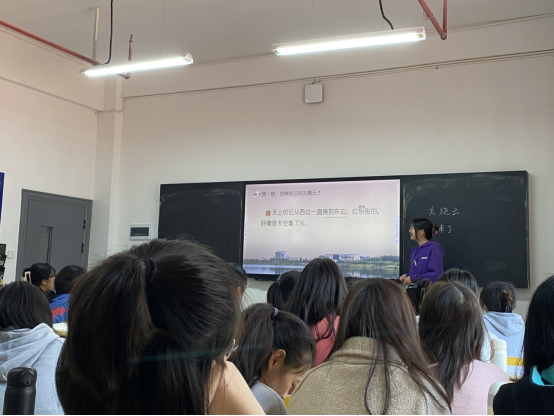 第三组同学邓旋展示了萧红的《火烧云》,对课文中所描绘的火烧云的颜色进行了形象介绍,同时也引导学生展示自己所熟悉的色彩词,周老师点评该课堂亲和力较强,同时邓旋同学在表达上完整准确,举止落落大方。最后,周老师引导学生在此后讲解课文中,要从内容上由浅入深,同时展示过程中力求语言表述完整。