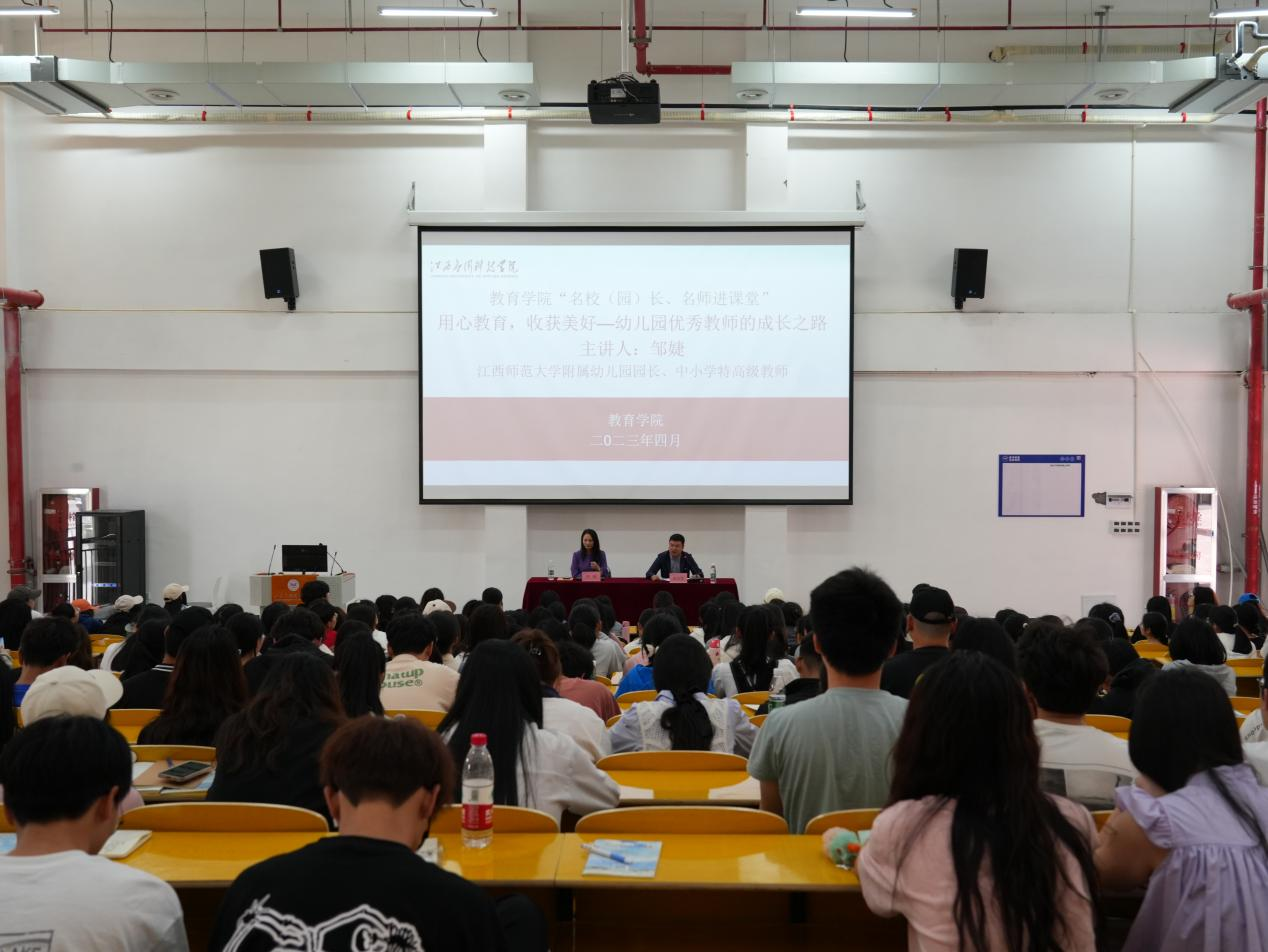 为了进一步密切学院与小学(幼儿园)的交流和沟通,深化“院-园、院-校”协同育人机制,发挥名校(园)长、名师及其团队的教学引领、指导、辐射作用,强化学院师生对基层小学(幼儿园)师资需求和课堂教学改革的清醒认识,加深学生对小学(幼儿园)教师专业知识、专业技能和教育情怀的认识和理解,提升学生的责任意识和专业使命感,教育学院筹划举办“小学(幼儿园)名校(园)长、名师进课堂”活动。4月16日学院邀请江西师范大学附属幼儿园园长、小学特高级教师、江西省第一批学前教育质量提升计划领航者、江西省幼儿园园长研究会理事邹婕老师在志远楼101教室为学院2020、2021、2022级学前教育专业讲授《用心教育,收获美好—幼儿园优秀教师成长之路》课程,学院院长郑昌保主持课程。