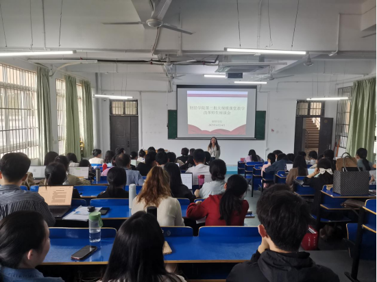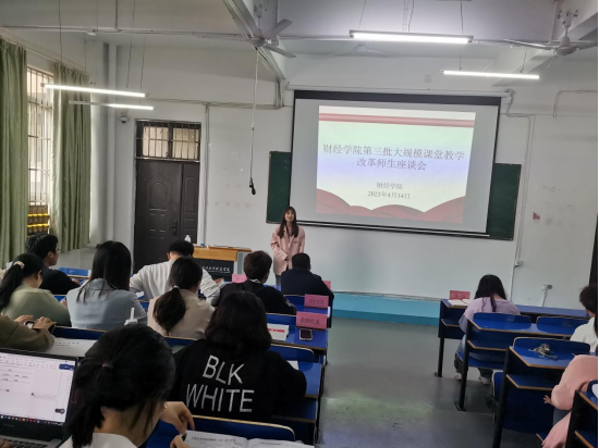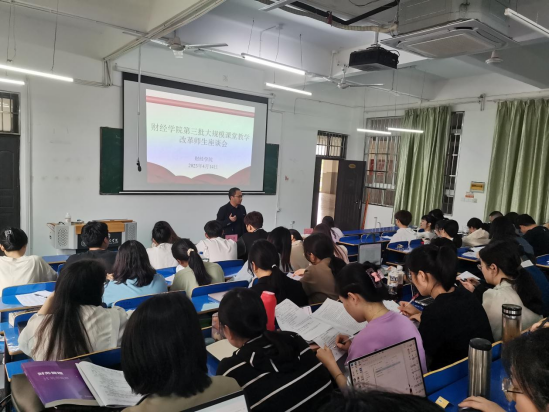 为进一步深化本科教育教学改革,提高人才培养质量,4月14日下午,财经学院在三达楼阶梯6教室召开第三批大规模课堂教学改革师生座谈会。院长揭志锋、教务科科长李静、全体专任教师及课改班级学生代表参会,会议由副院长匡文婷主持。