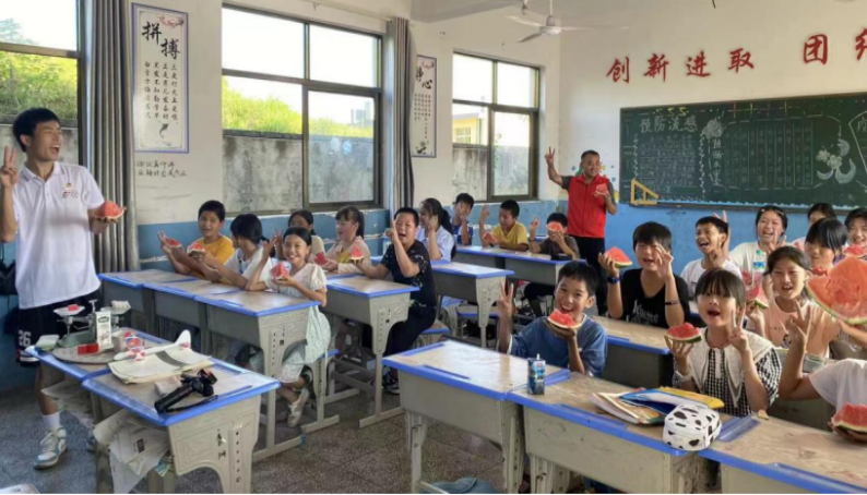 最后我们“童心燃梦助乡村”实践服务的实践人员在这炎热的天气下,提前为孩子们准备了凉爽的西瓜,让孩子们一同分享。