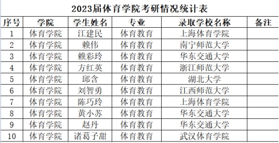 体育学院2023届毕业生考研工作再传捷报,10名学子不负众望,圆梦研究生,考研录取率为8.3%,位居全校第一。