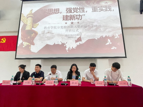 为扎实推进学习贯彻习近平新时代中国特色社会主义思想主题教育,做好我院师生入党积极分子的教育培养工作,进一步端正其入党动机,提升党性觉悟和政治素养,不断提高入党积极分子的政治判断力、领悟力和执行力。教育学院分党校于2023年5月25日,在志远楼101教室举行第26期入党积极分子培训班开班仪式。