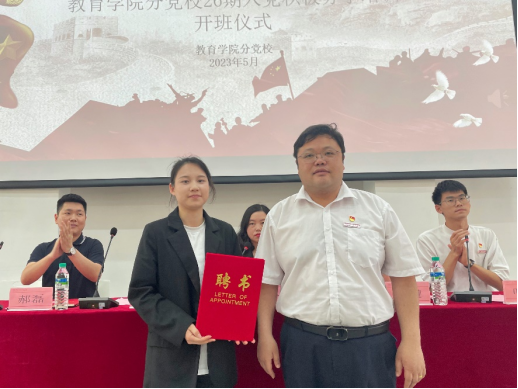 仪式第四项教育学院党总支书记、分党校校长宋春雷为第26期培训班班主任涂文露颁发聘书
