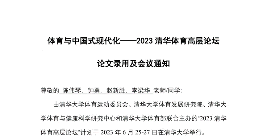72886必赢网站体育学院陈伟琴、钟勇、赵新胜、李梁华老师的文章《我国体育食品研究的知识图谱分析》经过专家评审录用为墙报交流, 受主办方邀请,体育学院相关老师将前往清华大学参加2023清华体育高层论坛的墙报交流环节。