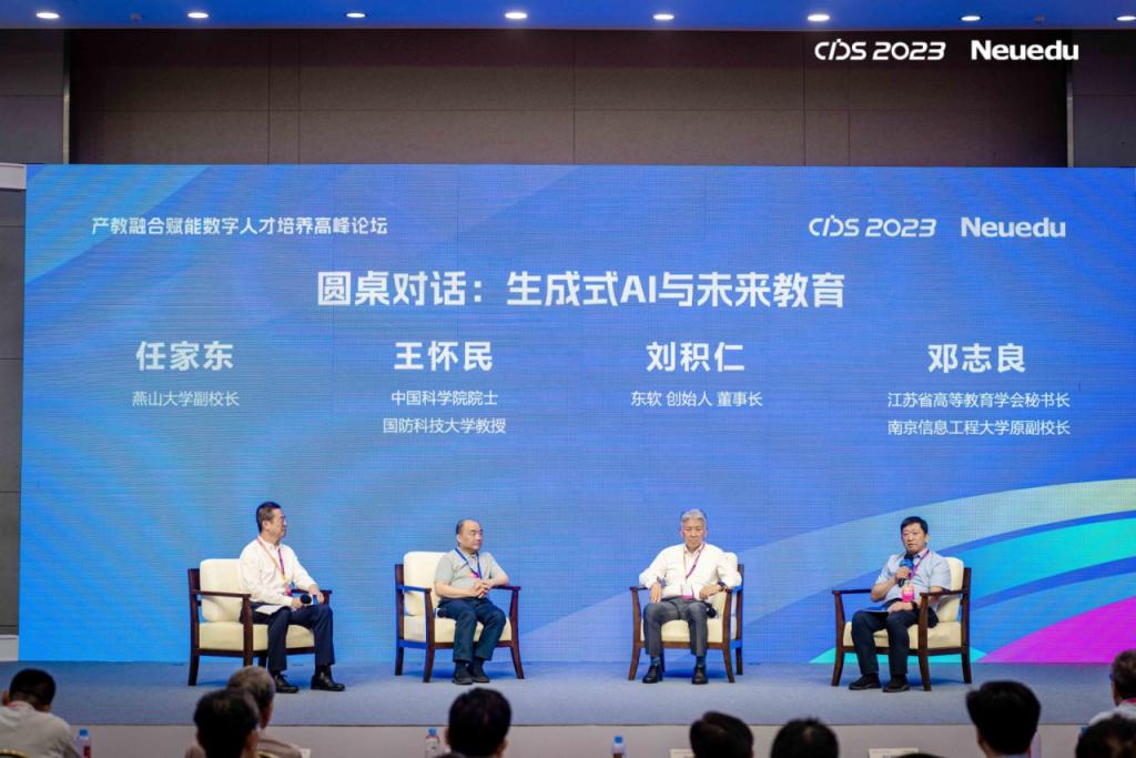 面对ChatGPT的出现带来的挑战,如何处理高等教育的变与不变、公平和效率的问题?在论坛的圆桌对话环节,行业院士和专家就“生成式AI与未来教育”问题进行了深入的探讨,四位嘉宾围绕应用潜能与现实挑战、深度融合与重要变革等多元视角开展深入的讨论,加深了教育领域对相关问题的理解与认识。