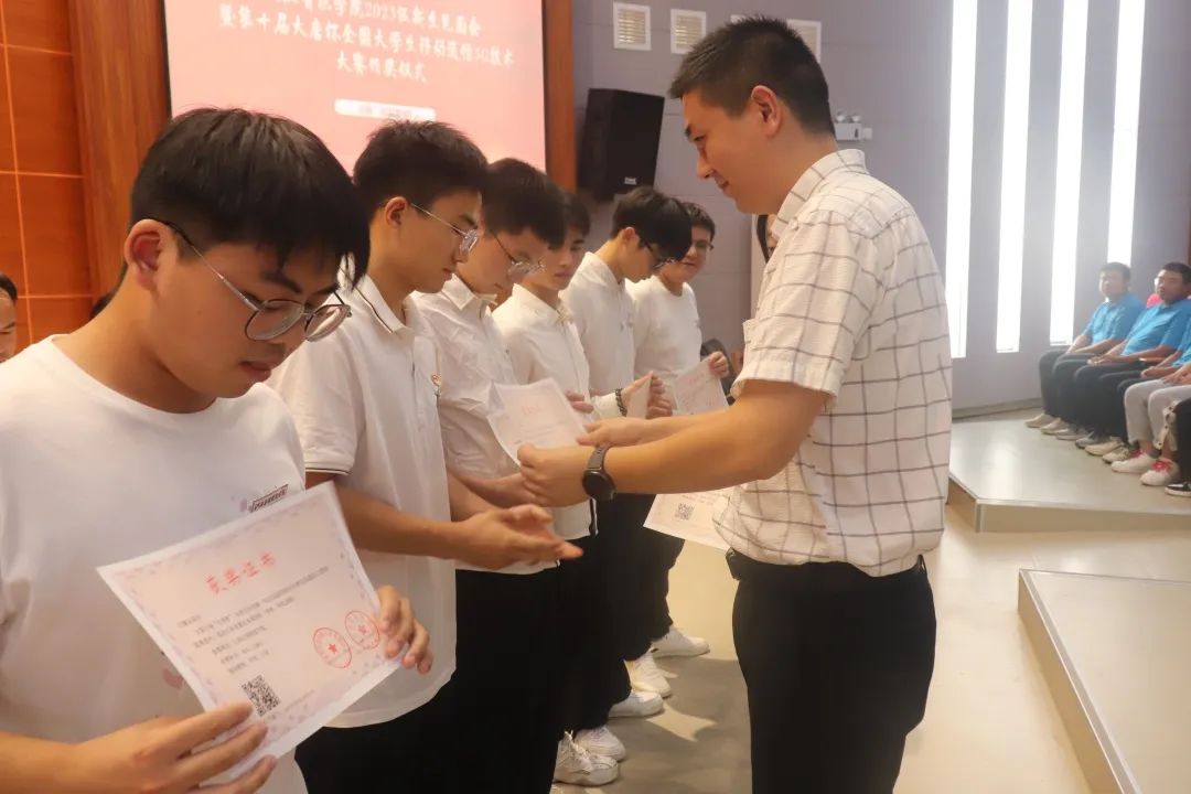 由贾鹏军科长宣读第十届大唐杯全国大学生移动通信5G技术大赛获奖者,由院长李俊、党总支副书记许永飞为获奖者颁奖。