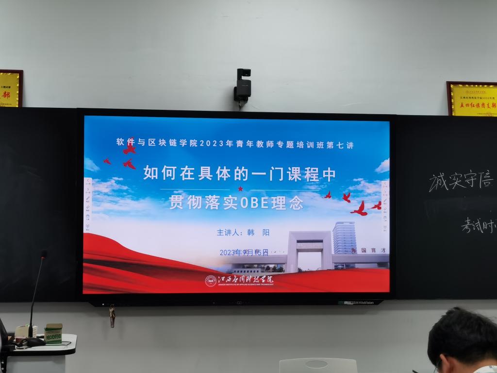 9月15日下午四点,软件与区块链学院青年教师专题培训班第七讲由学院副院长韩阳主讲,题为《如何在具体的一门课程中贯彻落实OBE理念》,活动在三达楼311教室举行,学院全体专任教师、企业教师、兼职教师参加活动。