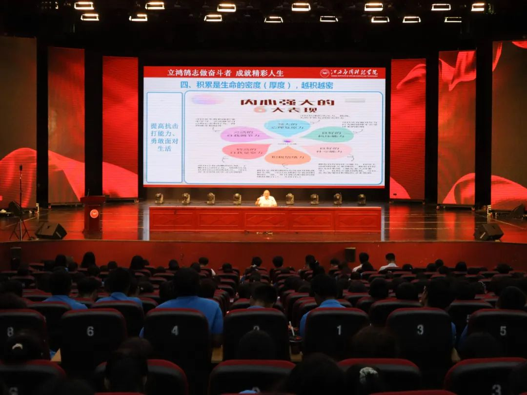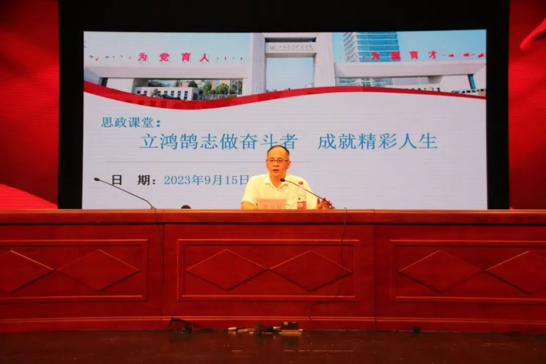 2023年9月15日下午,72886必赢网站国际商务学院在音乐厅举办了“2023级新生开学第一课”活动,其主题是“立鸿鹄志做奋斗者,成就精彩人生”,由学校副校长谢远健担任主讲人。