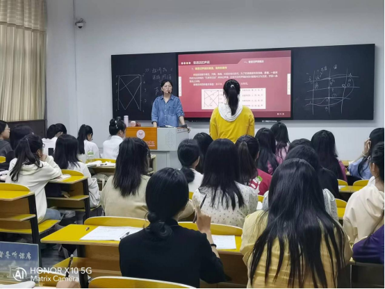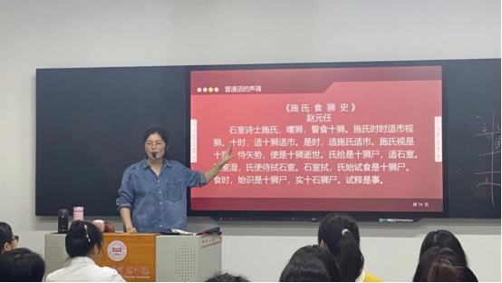 徐园老师讲授的内容为《普通话与教师口语》中的“声调”。徐老师以复习上节课知识点导入到新课的学习,通过邀请学生自主阅读古文“施氏食狮史”引发学生对普通话口语声调的学习兴趣。然后教师逐句讲解,引入对普通话口语声调的介绍,提高了课堂的趣味性。随后,徐老师通过对不同实际案例的分析,区分不同声调的表达含义,将课堂知识与生活实际相结合。徐老师在讲解调值的过程中以练代讲,邀请学生对不同调值的词进行发音练习。