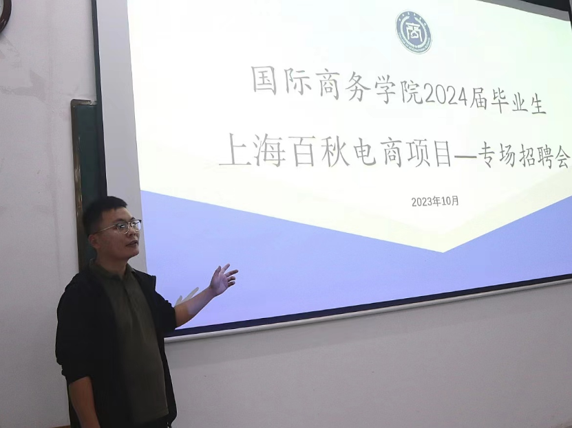 为进一步做好我院毕业生未来工作计划,帮助学生更好确定未来方向,激发对未来发展的积极态度,国际商务学院于2023年10月9日晚19时在三达楼阶梯一教室开展上海百秋电子商务有限公司校园招聘会。