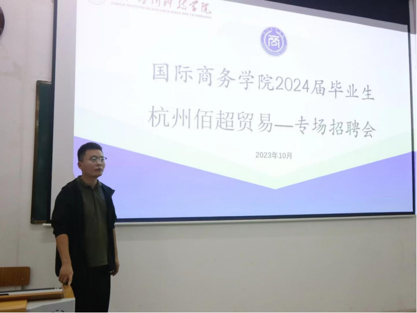 为推进高校毕业生高质量确定未来方向,畅通求职与招聘渠道,加强学校与用人单位的互动交流,2023年10月8日19点,国际商务学院于三达楼阶梯一教室开展了2024届毕业生校园招聘会,杭州佰超贸易校企负责人朱玉醒作为本次招聘会的主讲人。