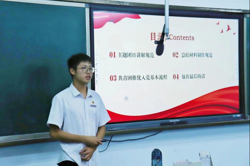 团总支组织部委员易晟同学为大家讲解了文件格式规范并提到,一份规范的总结材料是团支部工作的重要保证,所以文件需要严格遵循格式要求,以便提高工作效率。