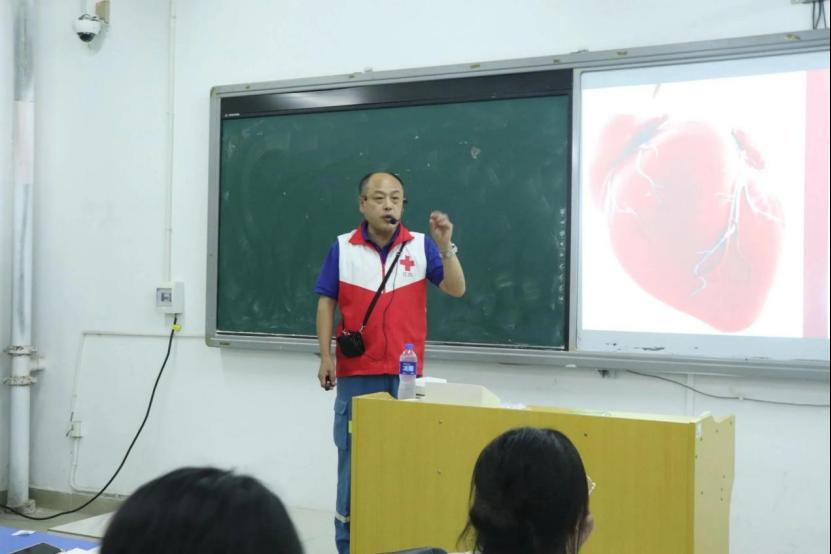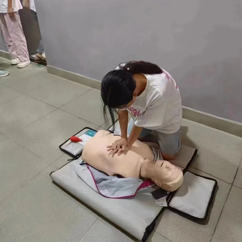 讲解完基本急救知识后,培训老师接着讲述了最重要的心肺复苏术(CPR),心肺复苏术中有许多注意事项,是我们必须牢记的,学子们也在老师的指导下,进行了模拟实操训练。