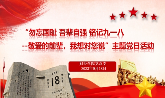 为纪念“九一八”事变发生 92 周年,大力弘扬爱国主义精神,对全体党员、师生广泛进行爱国思想政治教育,激发全体师生的爱国热情,引导广大师生铭记历史、勿忘国耻,厚植爱国主义情怀,9月18日,财经学院党总支开展“勿忘国耻 吾辈自强 铭记九一八--敬爱的前辈,我想对您说”主题党日活动,以深刻缅怀革命英烈,传承弘扬英烈精神。
