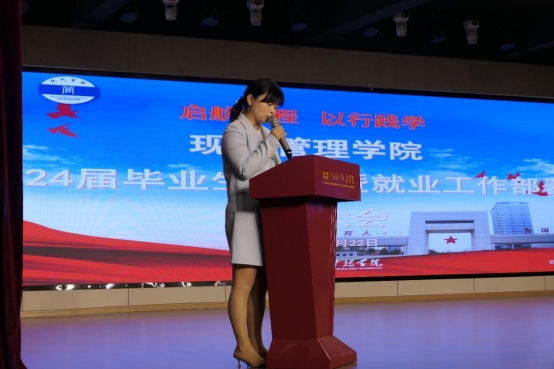 为扎实稳步推进2024届毕业生实习工作,更好培养学生的就业能力,确保2024届毕业生实习工作平稳有序开展,10月22日晚上7点,现代管理学院在产教融合中心召开了“启航新程,以行践学——现代管理学院2024届毕业生实习暨就业工作部署动员大会”,出席会议的有现代管理学院党总支书记李家刚、现代管理学院副院长漆圆方、现代管理学院教务科科长周蓉以及现代管理学院教务科副科长黄清。本次会议由现代管理学院教务科科长周蓉主持。