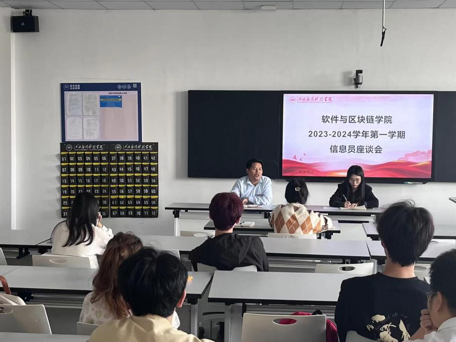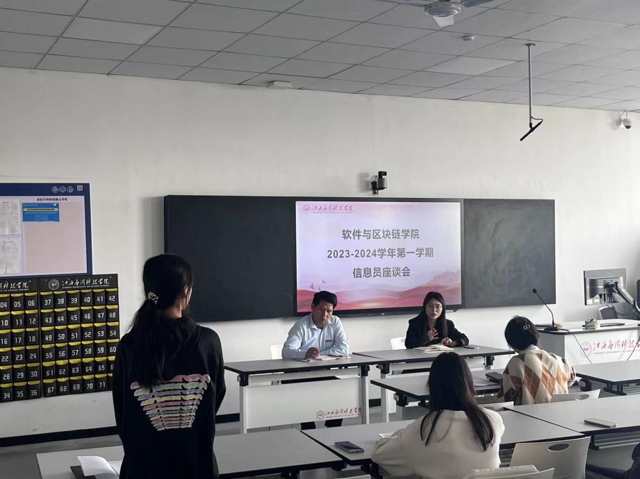 为了提高学院学生学习氛围,进一步提高教学质量,加强教学信息反馈,更好地了解与掌握教师和学生教与学的实际情况,软件与区块链学院于2023年10月18日中午在三达楼312教室召开2023—2024学年第一学期软件与区块链学院学生教学信息员座谈会,软件与区块链学院副院长韩阳、教务科全体成员及全院学生教学信息员参加会议。本次会议由卢迎迎老师主持。