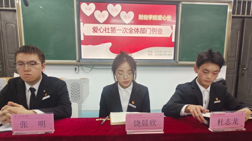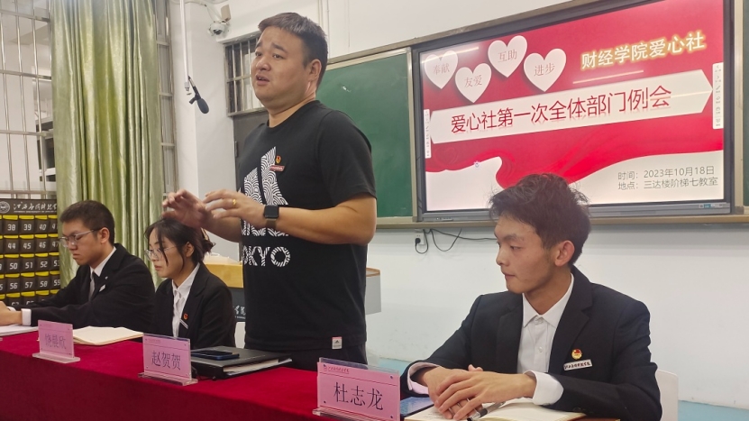2023年10月18日星期三,在三达楼阶梯七教室财经学院爱心社召开了第一次全体例会。出席本次例会的老师有财经学院团总支书记赵贺贺。本次例会由爱心社负责人饶晨欣、杜志龙、张明主持,爱心社全体成员参加。