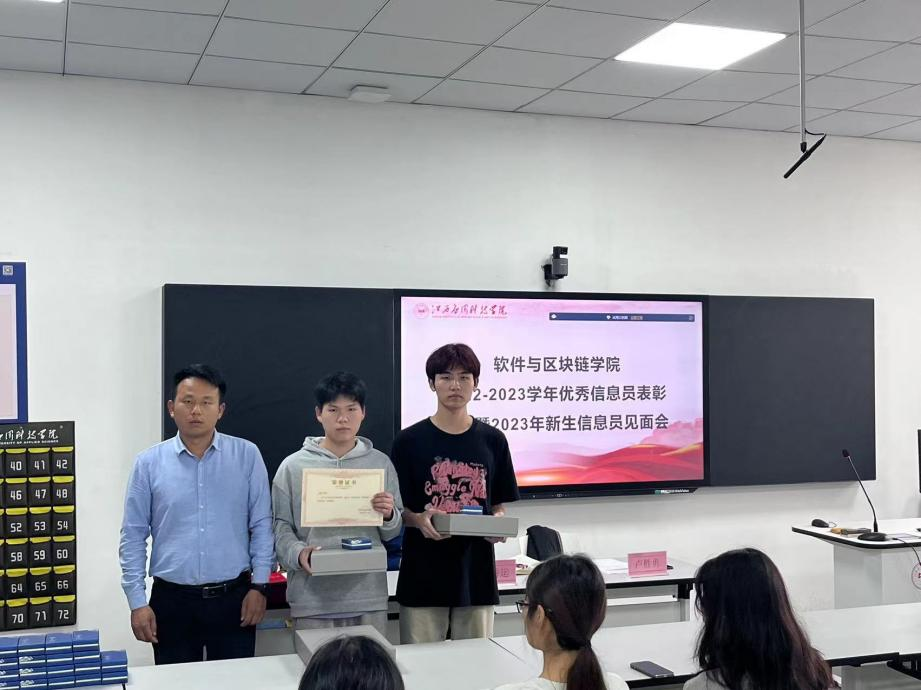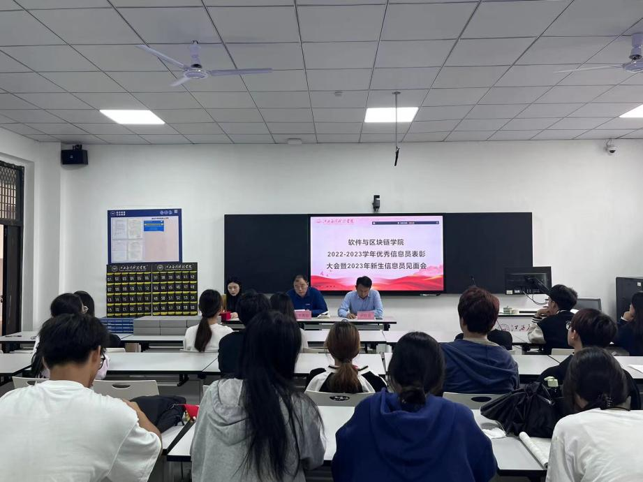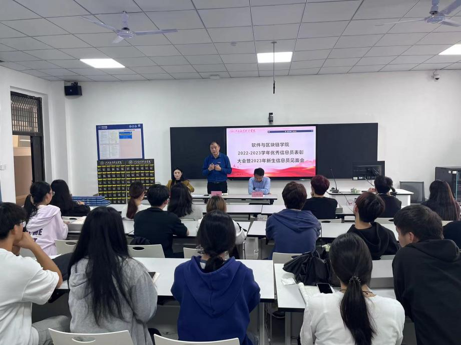 软件与区块链学院为进一步加强学生教学信息员管理,充分调动广大学生教学信息员工作积极性,充分发挥信息员作用,于10月25日召开2022-2023学年优秀信息员表彰大会暨2023级新生信息员见面会。会议由教务科卢迎迎老师主持,学院院长卞秀运、学院党总支书记书记卢胜勇、教务科全体老师与学院全体信息员参加了会议。