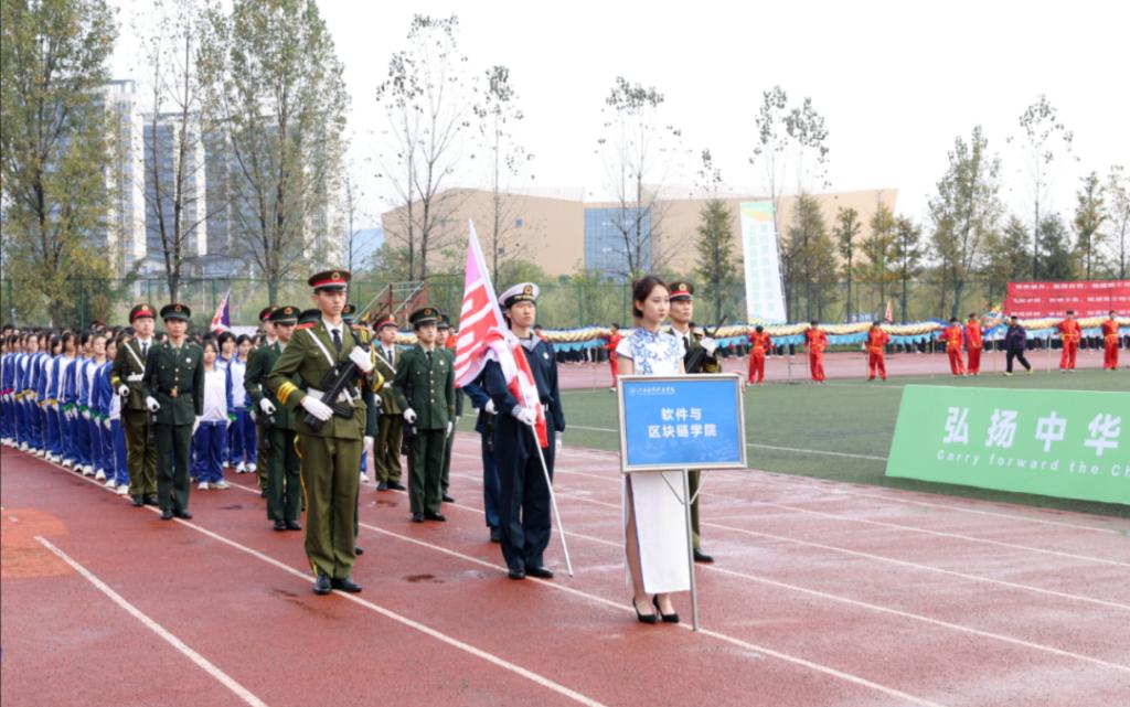 上午8点,运动会入场式正式开始,软件与区块链学院学子整齐入场,同学们昂首挺胸,英姿飒爽,踩着鼓点缓缓入场,为全校师生准备了一场精彩的视觉盛宴。学生和退伍士兵的步伐一致,服装动作整齐划一,大步向前,意气风发,舞动的红旗充分展示了软件与区块链学院学子的蓬勃朝气和青春活力。