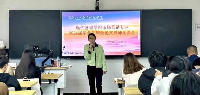 为进一步规范2024届本科毕业论文工作,切实提高毕业论文质量,2023年10月25日下午,现代管理学院市场营销专业于劲松楼104举行了2024届毕业生毕业论文导师见面会以及毕业论文指导手册的专项解读和指导会议。现代管理学院院长樊立君、副院长漆圆方出席见面会。全体毕业论文指导老师参加了此次会议。本次大会由市场营销教研室主任温玲英主持。