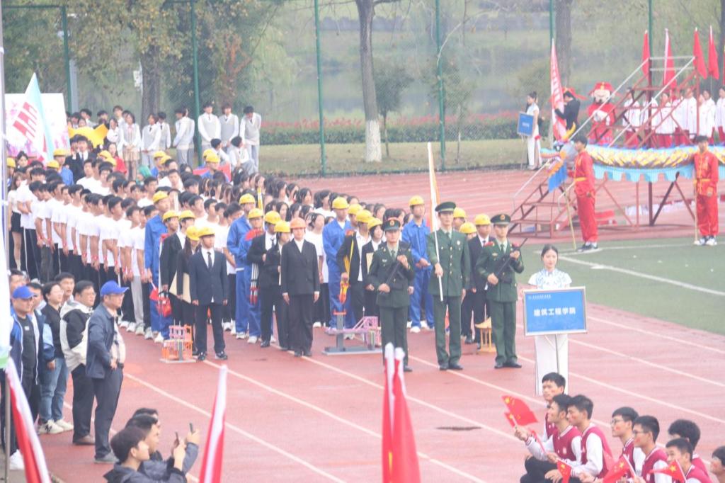 少年鲜衣怒马,不负盛世中华。国旗招展,恰如火炬。在校旗的引领下、开幕式表演人员、建筑工程学院代表方队齐步入场,他们步伐整齐、口号响亮、精神抖擞、斗志昂扬,成为最美的风景线。