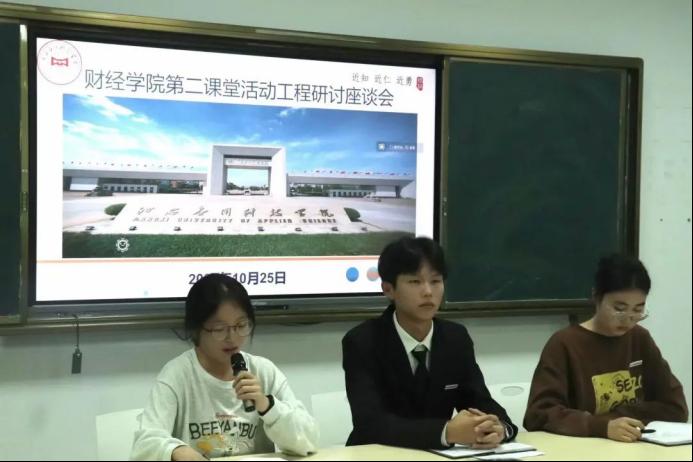 为了促进广大学生对第二课堂活动工程的了解,我院于2023年10月26日晚在行知楼318教室开展财经学院第二课堂活动工程研讨座谈会,出席本次会议的有第二课堂部分干事、各班级第二课堂负责人。