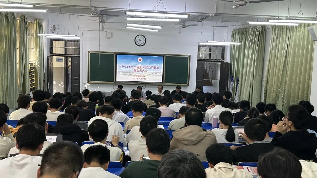 人工智能学院于2023年10月31日在阶梯九开展了“2023年社会实习实践赴岗教育暨动员大会”,出席本次会议的人员有:人工智能学院院长李俊,人工智能学院党总支副书记许永飞,人工智能学院常务副院长殷军,人工智能学院学工科科长贾鹏军,人工智能学院教务科科长马启科以及20级本科全体学生。