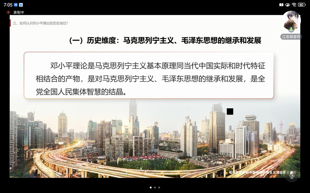 首先,江志斌老师对专题六第三讲的教学内容——如何认识邓小平理论的历史地位,进行备课经验分享。江老师立足三个维度来讲解这一内容:第一,从历史维度解读邓小平理论是对马克思列宁主义、毛泽东思想的继承和发展;第二,从理论维度分析邓小平理论是中国特色社会主义理论体系的开篇之作;第三,从实践维度阐释邓小平理论是改革开放和社会主义现代化建设的科学指南。