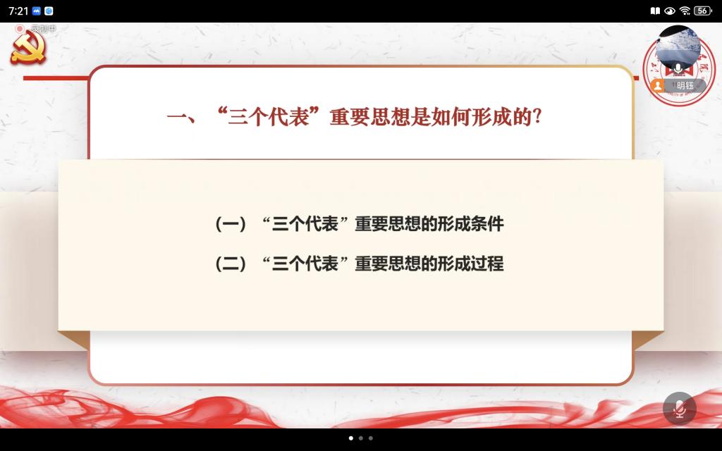 其次,刘明钰老师分享了专题七第一部分的教学内容——“三个代表”重要思想形成条件的备课经验。刘老师认为应从国际局势与国内形势两方面进行切入,力求从整体把握“三个代表”重要思想是如何形成的。刘老师抛出“如何理解改革开放以来形成的新的社会阶层也是中国特色社会主义事业的建设者?”这一问题,指出可以针对学生所学专业进行解析,帮助学生对理论知识的有效理解。