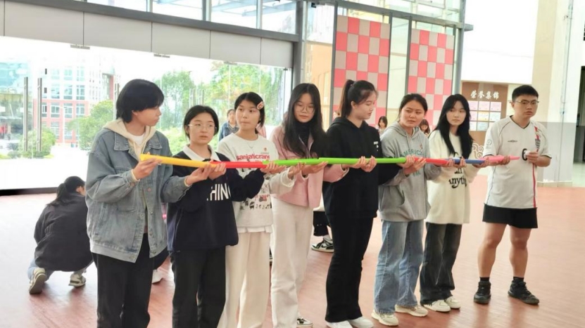 同学们围成一个圈,顺时针移动接力保证手中PC管竖立不倒,非常考验同学们的配合能力以及默契。