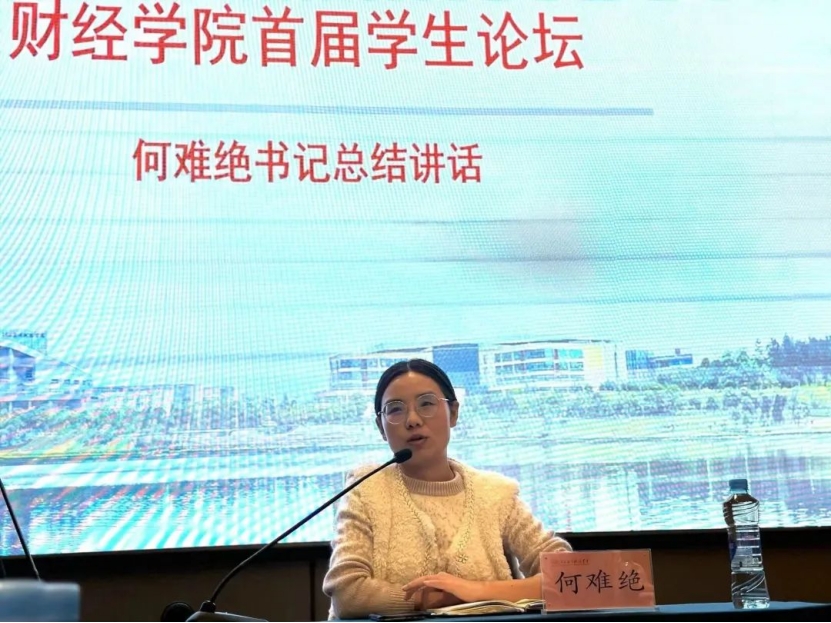 论坛伊始,由财经学院党总支书记何难绝发表讲话。书记为大家分享了她的经历,向我们传达了每个人生活都是不容易的,大家都在负重前行,但是对待生活和工作的热情不应随时间的流逝和压力的增大而逐渐消退,鼓励大家要有信心不断上进,同时书记还强调大家应该成为有品德有品行有品味的大学生。