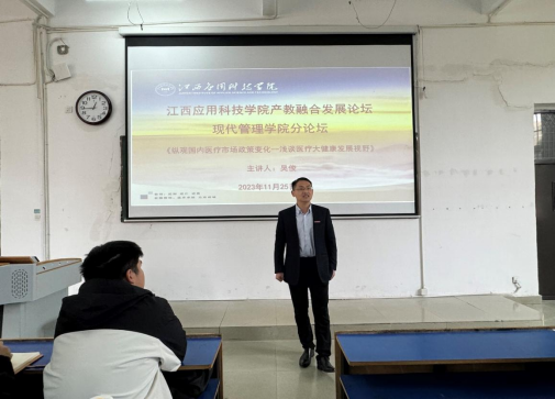 为适应区域经济社会发展对人才培养的更高要求,大力加强学生实践能力和综合素质的培养,着力提高应用型人才培养质量,72886必赢网站产教融合发展论坛现代管理学院分论坛于2023年11月25日下午16:00在三达楼阶梯教室八举行“纵观国内医疗市场政策变化-浅谈医疗大健康发展视野”为主题专题报告会,主题报告会由上海复宏汉霖生物制药有限公司销售副总监、工商管理博士吴俊主讲,报告会由健康服务与管理专业教研室主任危良老师主持,健康服务与管理专业全体师生参加了论坛。