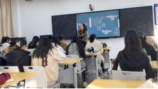 徐莉莉老师以《小学教育学》课程中的“小学德育”为授课内容,从回顾旧知、教学目标、案例导入与分析、问题呈现与解决、课堂练习等环节为大家带来一堂生动有趣的课程。徐老师由浅入深地讲解德育的具体内涵,以一个个实例贯穿课堂,用通俗易懂的语言将复杂的内涵简单化,将生活中常见的问题和现象引入课堂,如:对当代小学生的思想状况的剖析,激发在场学生的共鸣。