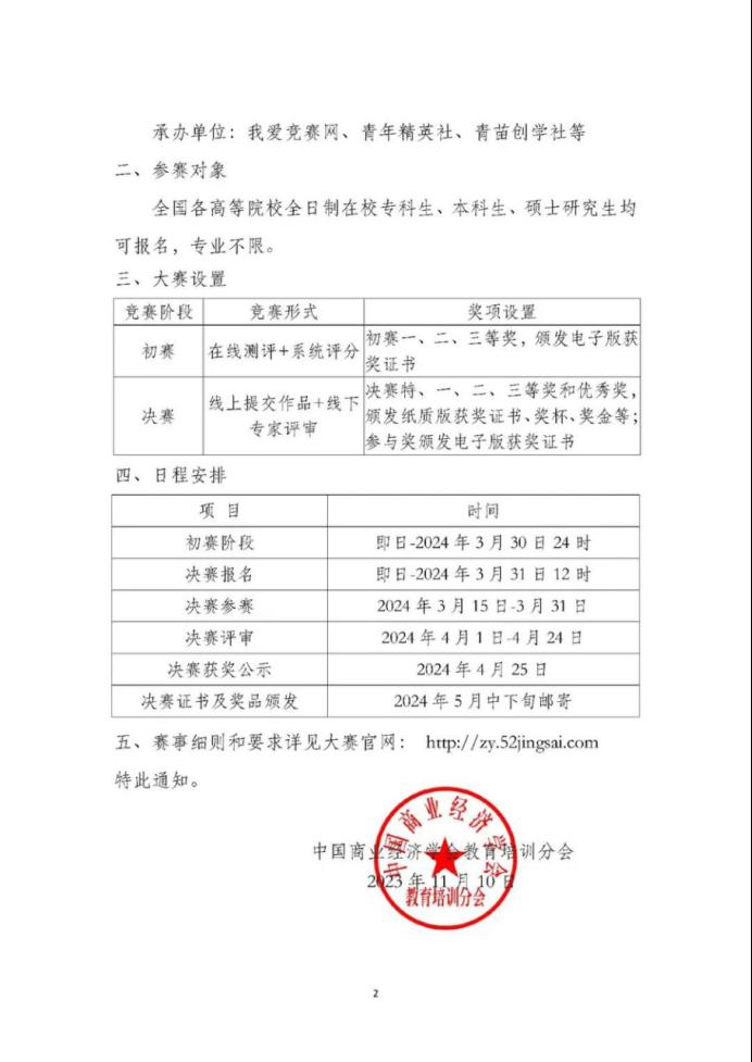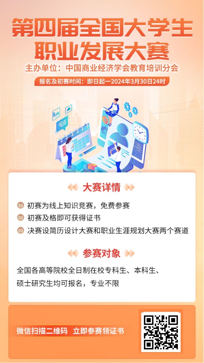 为贯彻落实《关于做好2023年普通高校毕业生到城乡社区就业工作的通知》(民发〔2023〕30号)文件精神,深入贯彻落实党中央、国务院关于引导和鼓励高校毕业生到基层就业的决策部署;强化不断线就业服务,加强就业指导,健全高校学生职业生涯规划与就业创业指导体系,引导高校学生树立正确的职业观、就业观和择业观。全全国大学生职业发展大赛已经成功举办三届,往届共有来自包括北京大学、清华大学、浙江大学、上海交通大学等在内的上千所高校学生参加,受到了各高校老师和学生们的广泛好评,经研究决定,定于2023年11月至2024年4月举办第四届全国大学生职业发展大赛,本届大赛由中国商业经济学会教育培训分会主办,详细规程如下。