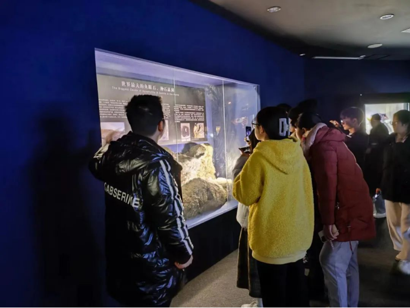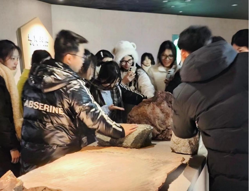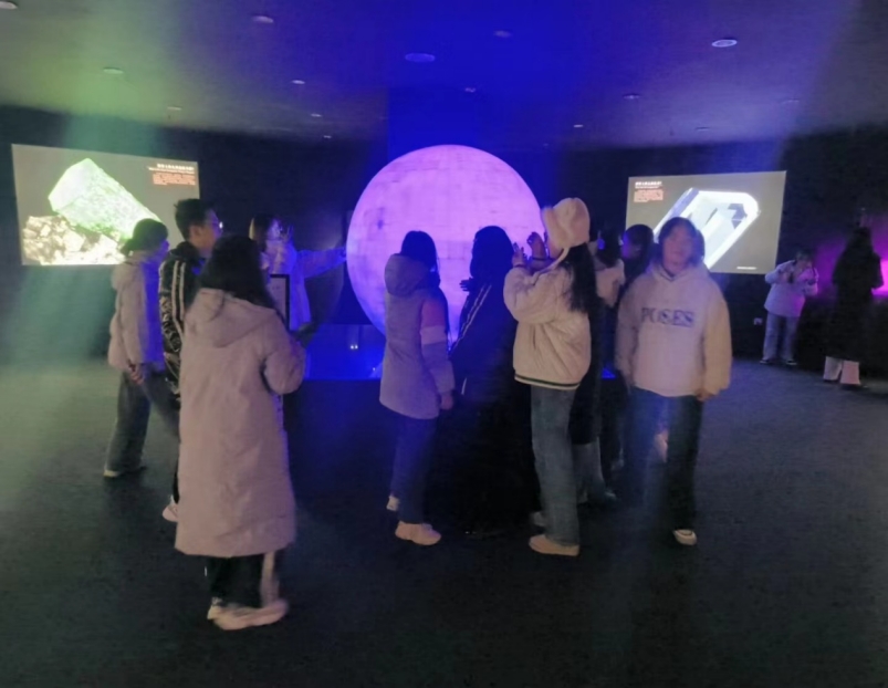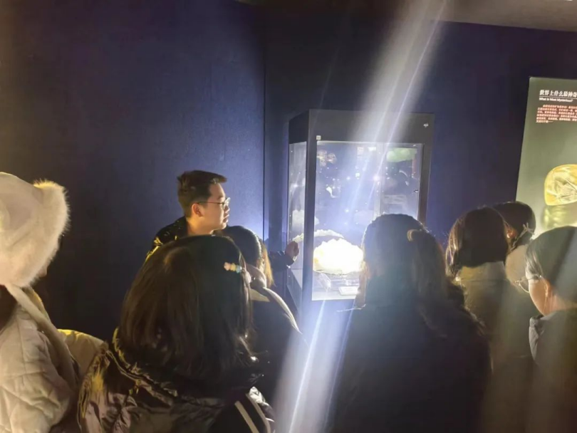 在体验区中,同学们与讲解员一同探索了矿洞中的秘密;在荧光室中,流光溢彩的宝石在正常灯光下平平无奇而在紫外线下散发着无限魅力;在成因区中,讲解员向同学们介绍了来自天上的宝石——陨石碎片,同学们都纷纷惊讶于大自然的魔力。