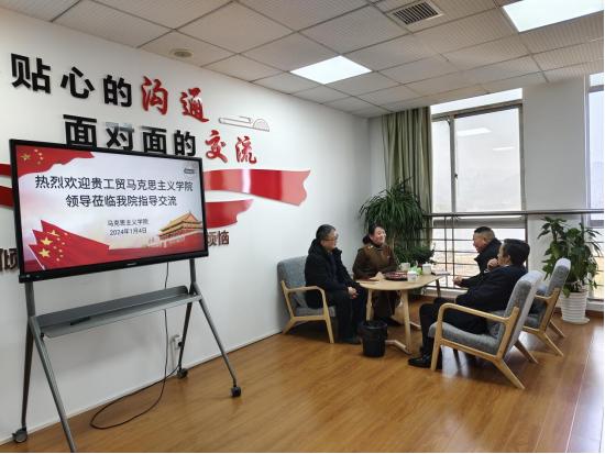 贵州工贸职业学院党委副书记、纪委书记聂立新、贵州工贸职业学院马克思主义学院院长王贵湖与必赢官网马克思主义学院院长于冰雁、副院长胡杏根就学院管理和课程建设、师资引进等相关工作以座谈的形式展开了亲切交流。1月4日,于院长首先对贵州工贸职业学院马克思主义学院王院长的到来表示热烈欢迎,随后,听取了王院长对他们学院目前情况的简单介绍后,于冰雁院长也详细介绍了我院建设情况以及课程建设、师资培养等方面的情况。最后双方就一些共性的问题共同交流了意见。