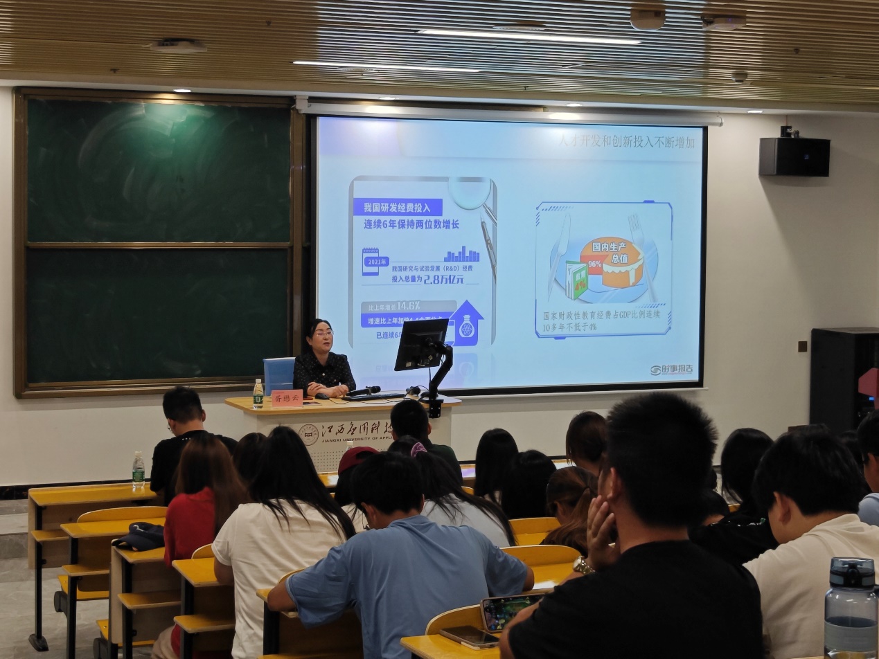 讲座上,胥校长从洞悉大势,人才强国的战略考量;立足当下,人才发展迈入新阶段;谋篇布局,聚天下英才而用之;这三个方面来讲述现当今社会对人才的发展需求以及培养策略。通过一些很直观的数据让新生了解到人才是第一资源,“青年科技人才”是国家战略人才力量的源头活水。让新生们了解到自己身上的重担。为培养青年人才,她提出:“需加快建设世界重要人才中心和创新高地;深化人才发展体制机制改革;加快建设国家战略人才力量;全方位培养、引进、用好人才;营造识才爱才的环境。同时,她鼓励同学们要学好英语,毕竟英语是出国学习的基础。正所谓,学习英语是通向世界的窗口,能够扩大自己的视野,增加对这个世界的认知。
