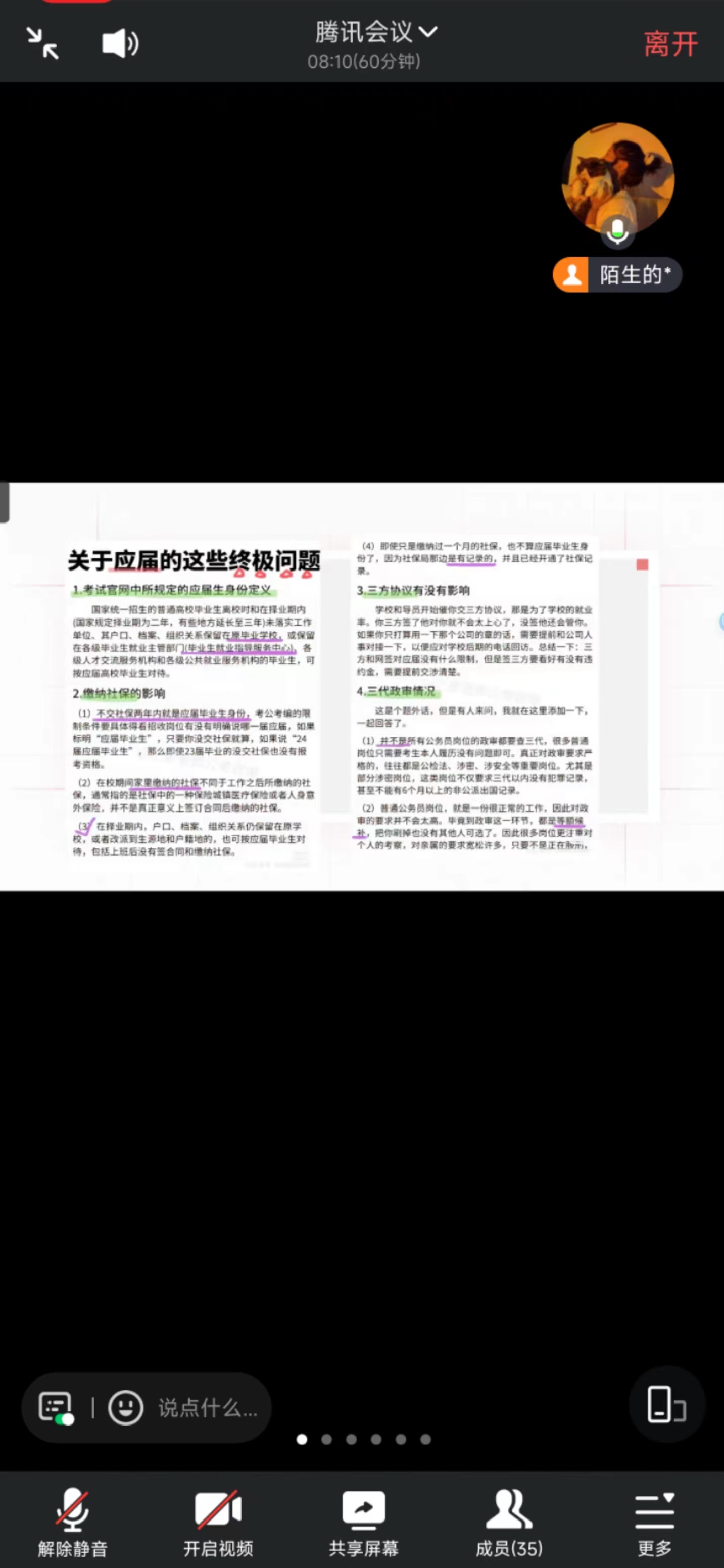本次班会还重点介绍了同学们在就业时需要注意的事项,如工作需要签订纸质合同,合同必须具备哪几点,试用期应如何维护自己利益等等,内容丰富且都为大家急需了解并掌握的工作常识。对于大家非常重视的三方协议与应届毕业生身份,辅导员陈蓉也进行了详细的解释,让大家明白了签署三方协议并不等于失去应届毕业生的身份,未签订正式合同两年内未缴纳社保都还保留应届毕业生身份。