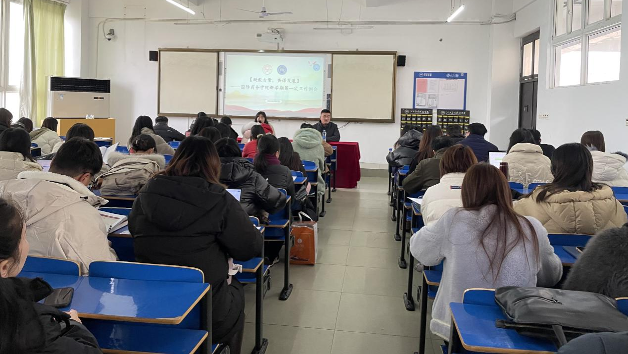 2024年2月27日下午,国际商务学院全体教师例会暨2023~2024学年第二学期第一次开学筹备会议在三达楼204教室召开,国际商务学院院长王慧、国际商务学院党总支书记徐青、国际商务学院副院长李居英及全体行政干部、教职工参会。