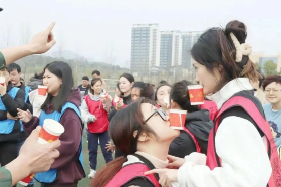每队10人,各站成一排,每个人发一个纸杯,并用嘴将其衔住,项目进行中不能用手扶纸杯;往每个小组第一名老师的纸杯中倒入定量的水,再由第一名老师将水倒入第二名老师的纸杯中,以此类推;最后一名学员将水倒入大的容器中,在规定时间内,大容器中积水最多的小组获胜。