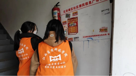 志愿者们两两配对进入被分配的楼栋里进行清理。在打扫的过程中,志愿者们仔仔细细地检查社区内是否有小广告的张贴,发现小广告时就用力擦拭、铲除,将原本斑驳混乱贴有小广告的墙面重新变成了干净整洁明亮的样子。