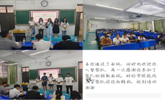 校风校纪督察队于9月17日分别在三达楼阶梯六、阶梯七展开新生面试,同时了解了新生们的基本情况并确认他们是否都符合部门要求。在面试流程结束后,面试官对最终人选进行讨论,并以短信形式发布面试结果,恭喜新生成为财经学院校风校纪督察队的一员,并对新人的加入表示热烈的欢迎!