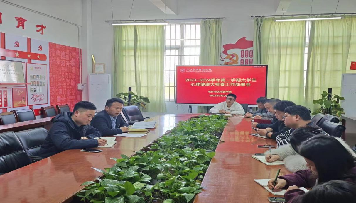 为促进学生身心健康、全面发展,为认真贯彻党的二十大精神,贯彻落实《国务院关于实施健康中国行动的意见》,响应《全面加强和改进新时代学生心理健康工作专项行动计划(2023-2025年》文件精神,做到及时发现、有效预防、及时干预大学生的心理健康问题,我院于2024年3月20日在三达楼210室召开大学生心理健康大排查工作部署会,学院党总支书记卢胜勇、学工科副科长王冰及全体专兼职辅导员参与此次会议。
