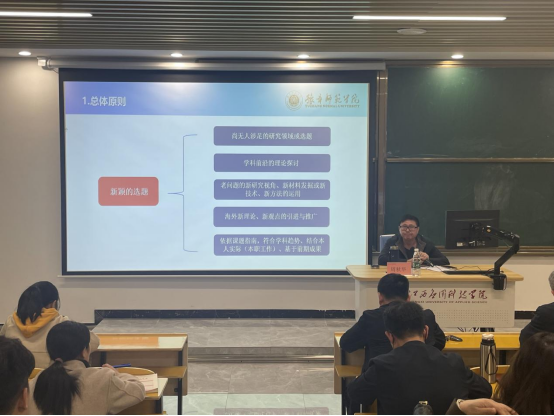 周教授结合自身科研经验从明细标准、确定选题、论证课题和提升观念四个方面对高校教师如何申报课题进行了深入浅出的讲解。他以申报社科基金项目为例,分享了课题申报的系列经验:从确定选题说起,要重点关注选题原则、选题分析、选题常见的问题;对如何撰写课题申报书,他解读了申报书的结构和写作技巧,指导教师如何准备全面、系统的方案,以确保课题研究的科学性和可操作性。他还鼓励青年教师,要积极、大胆、精心的准备申报,过程比结果重要。要提升观念,重在选题、优在论证、成在细节,贵在坚持。