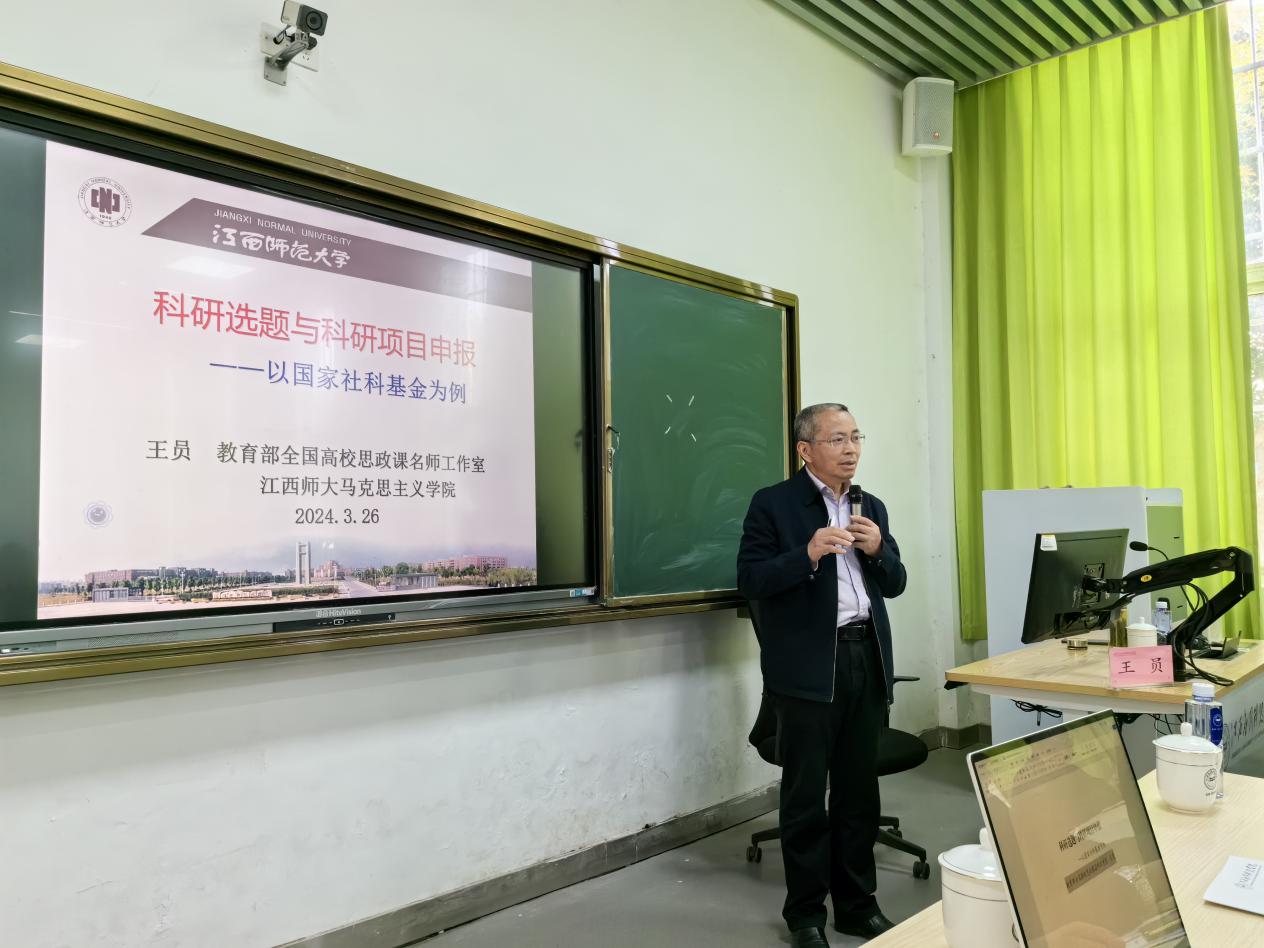 百年大计,教育为本;教育大计,教师为本。为深入贯彻“3·18”重要讲话精神,提高教师科研能力,激活科研创新的一池春水。3月26日,马克思主义学院邀请了江西师范大学马克思主义学院博士生导师、博士后导师、教育部全国高校思政课名师工作室主持人、国家社科基金通评专家王员教授进校开展《科研选题与科研项目申报——以国家社科基金为例》专题讲座。学校党委副书记、纪委书记江星、校党委宣传部副部长凌勇、党办副主任李飞艳及全体思政课教师参会学习,讲座由马克思主义学院院长于冰雁主持。