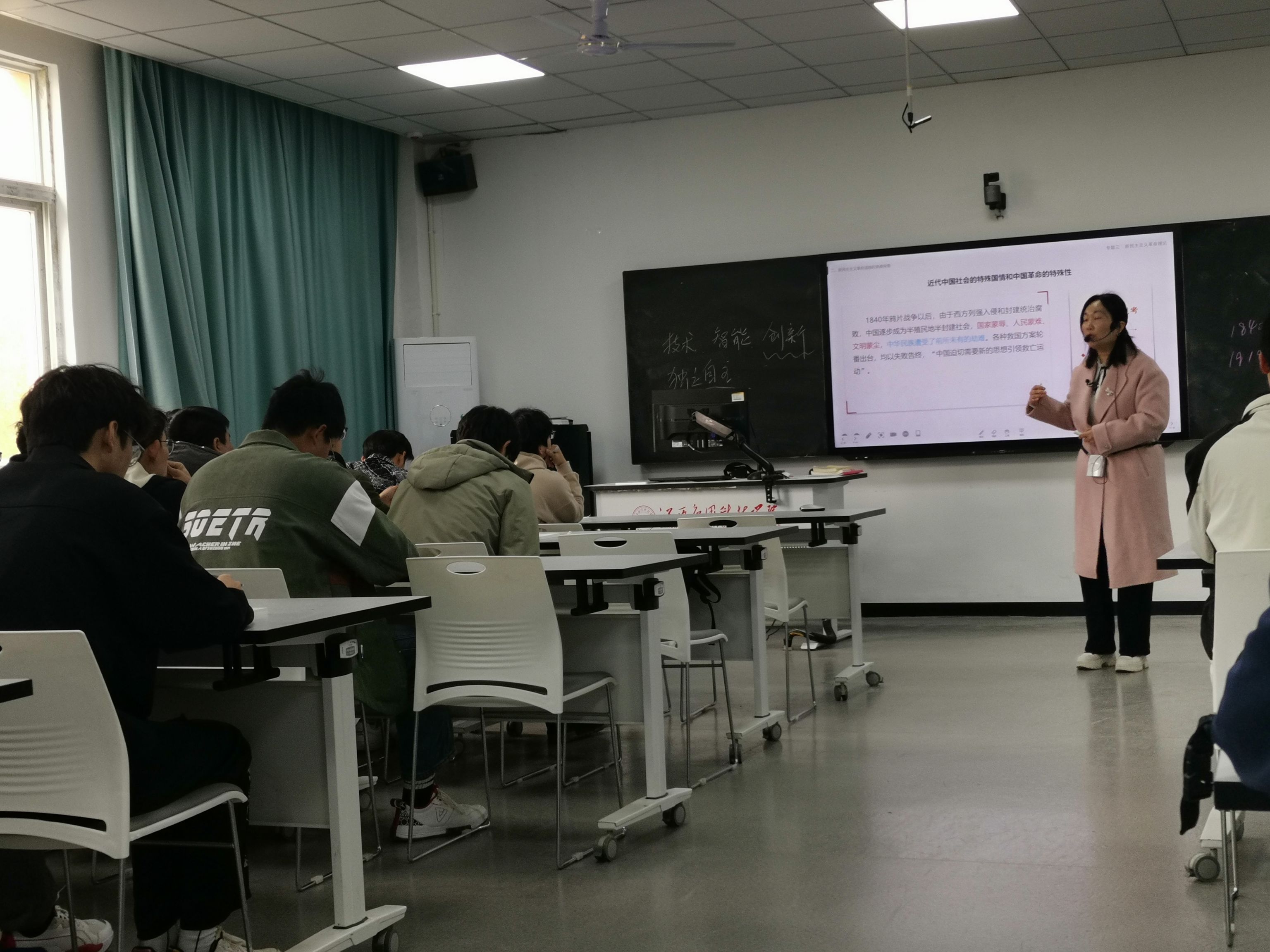 为深入贯彻落实习近平总书记关于“大思政课”建设的重要指示精神,持续推进思想政治理论课教学改革创新,以增强课堂教学效果,提升学生思政课程学习的获得感。全面落实江西省“大思政课”问题式专题化团队教学改革要求,充分发挥思政课立德树人关键课程作用,增强学生学习思政课的积极性、主动性、创造性,让思政课入脑、入耳、入心。马克思主义学院积极创新教学方法,丰富教学内容,提升思政课程的吸引力,增强高校思想政治教育效果。2024年3月22日,我院邀请江西科技师范大学张丽老师开展以《毛泽东思想和中国特色社会主义理论体系概论》课程为依托的“一课多师”示范教学,给22本智能科学与技术2班的同学们带来了一堂别具一格的思政课程。